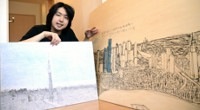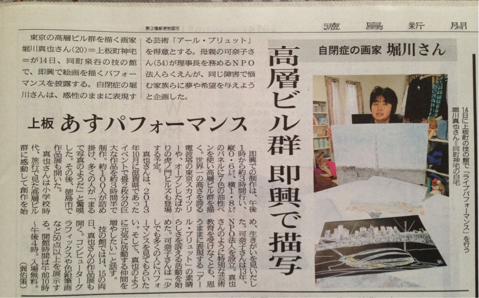 高層ビル群を中心にした作品を描く自閉症の絵画作家、堀川真也さん(20)=上板町神宅=が14日午後1時から、即興で絵を描き上げるライブパフォーマンスを同町泉谷の「技の館」で披露する。記憶や想像力を基に、フェルトペンやボールペン、鉛筆などを使った独自の技法で作品を手がける真也さん。県内でのパフォーマンスは初めてで、母親の可奈子さん(54)は「息子の活動を通じて、障害のある人が秘めている可能性を感じてほしい」と話している。(三浦孝仁)