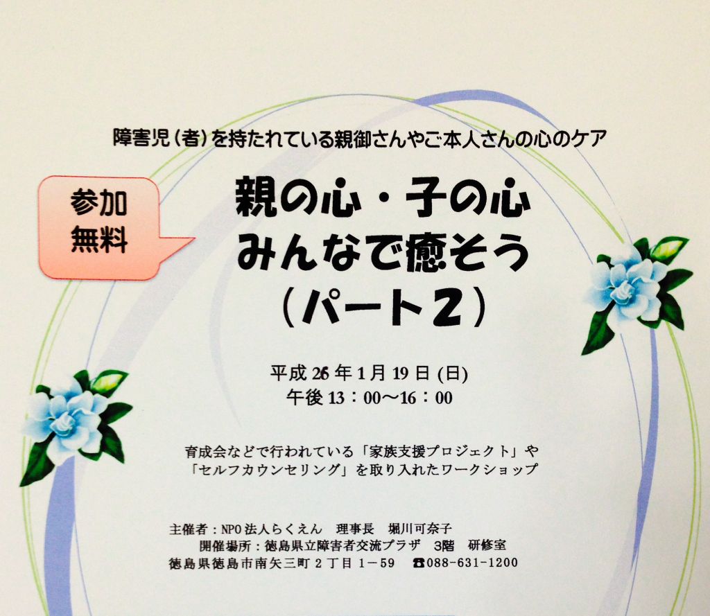 さて、話は変わりますが、今週の日曜日1月19日の午後1:00〜16:00まで、NPO法人らくえん主催の「親の心・子のの心みんなで癒そうパート2」を開催します。育成会などで行われている家族支援プロジェクトやセルフカウンセリングも取り入れて保護者やご本人さんも参加されて心のケアをする会(ワークショプ)です。