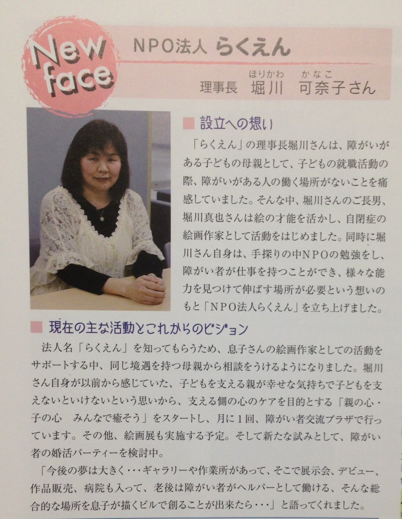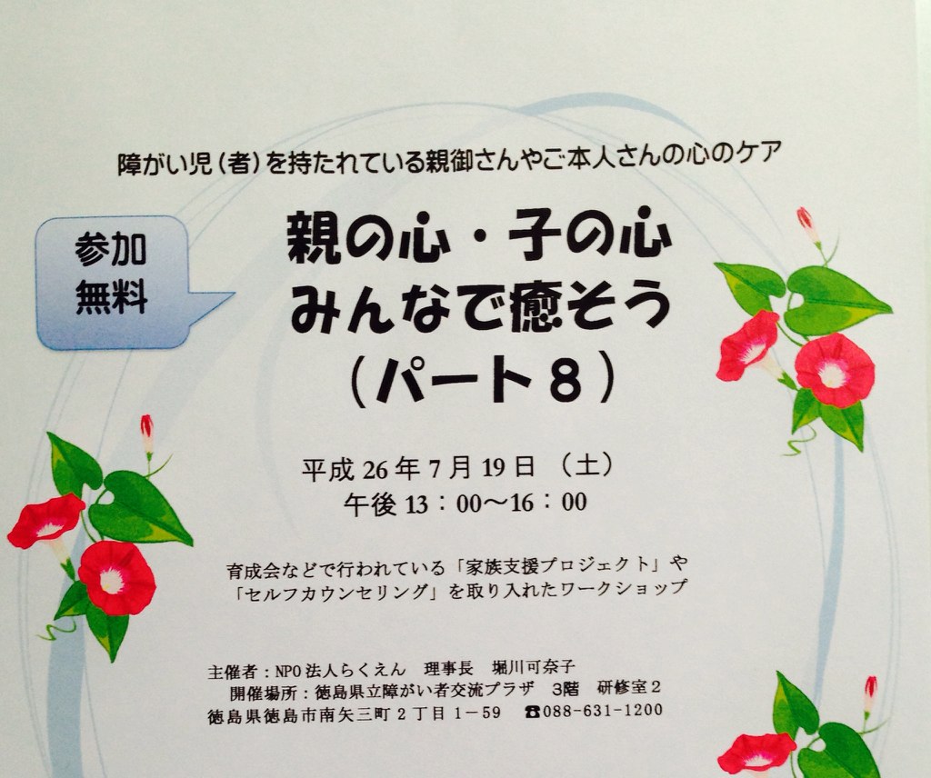 先月、6月14日にNPO法人らくえん主催の「アール・ブリュット徳島」を開催致しました。自閉症の画家 堀川真也氏のライブパフォーマンスがドキュメンタリー番組となり放送されました。『株式会社ひのき・キューテレビ』タイトル「ありのままに生きて」 障がい児(者)を育てている親が育て難い子どもを育てている様子が映されています。他にもっと大変な親御さんもおられると思いますが、なかなかオープンに出来ないと思います。今回、このような形で多くの人々に知って頂く事は大切な事だと思いました。ぜひ、見て下さい。