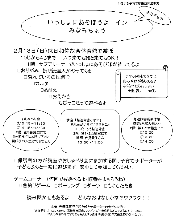 発達障害児(者)と親とサポーターの会あおぞら主催で、