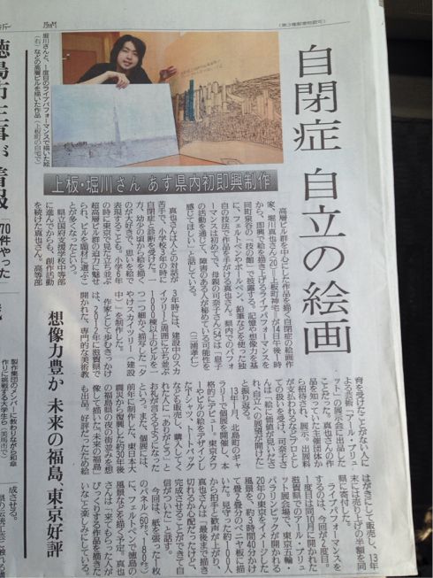 自閉症で、高層ビル群などをテーマに創作を続けている絵画作家、堀川真也さん(20)=上板町神宅=が14日、上板町の「技の館」で、絵を即興で描き上げるライブパフォーマンスを披露した。下絵や写真などを見ずに、一気に絵を完成させる手法に、見守っていた見物客からは感嘆の声が上がっていた。